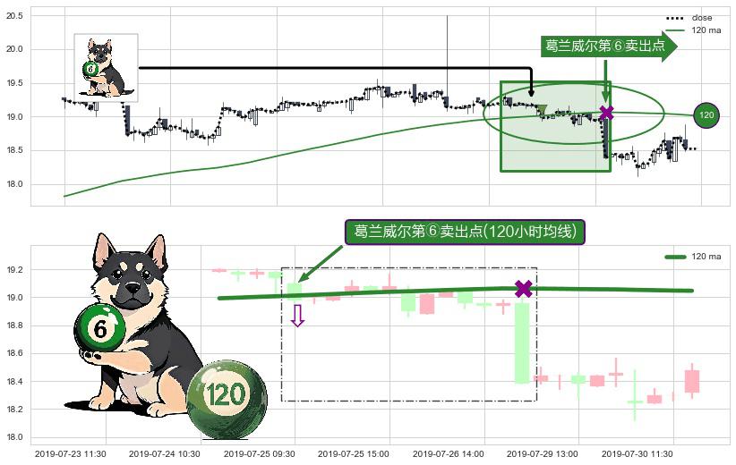 形态多维评估: ⚀ 2019-07-25 09:30:00-小时显现 葛兰威尔均线 120小时均线 第⑥卖出点 走势反转见顶信号,后市看跌,卖出信号