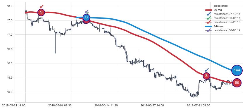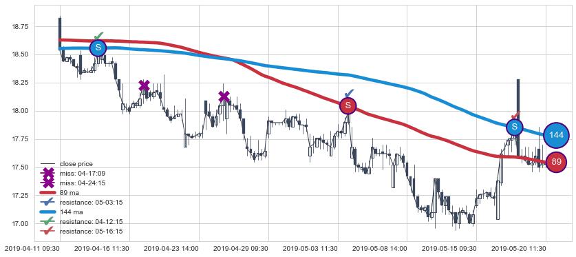 下跌趋势05-21 14:00-07-17 09:30,均线144, 89确认关键阻力3处