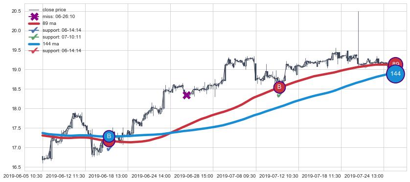 上涨趋势06-05 10:30-07-25 09:30,均线144, 89确认关键支撑2处