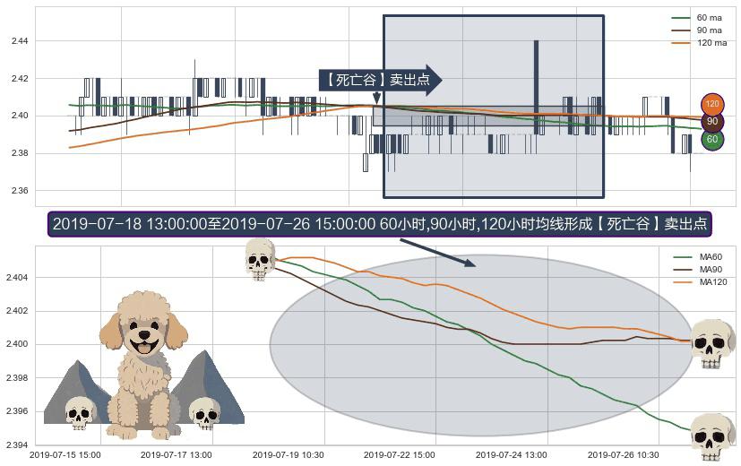 ⚀ 2019-07-18 14:00:00-小时至2019-07-26 15:00:00-小时显现 60小时-90小时-120小时均线 【死亡谷】卖出点 看空信号,后市看跌,卖出