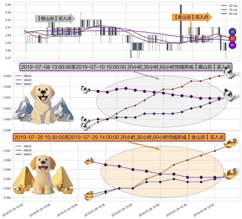 ⚀ 2019-07-26 11:30:00-小时至2019-07-29 14:00:00-小时显现 20小时-30小时-60小时均线 【金山谷】买入点 其再次确认了买入信号,可靠性更强,买入