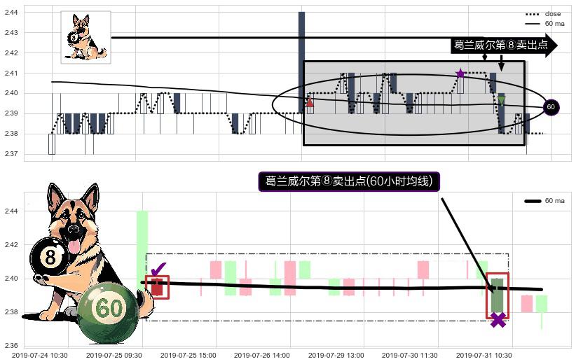 ⚀ 2019-07-31 09:30:00-小时显现 葛兰威尔均线 60小时均线 第⑧卖出点 下降趋势的中继信号,后市看跌,卖出信号