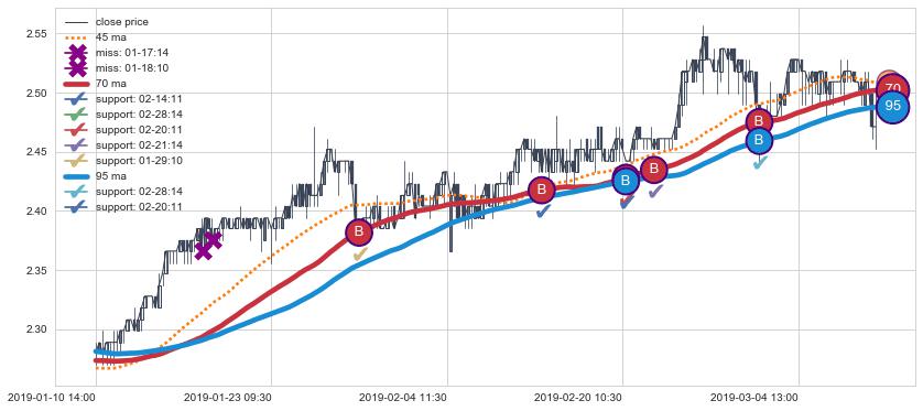 ⚅ 卖点向下突破均线后,价格走势很纠结,不断在均线周围试探,有再次上探突破均线的可能