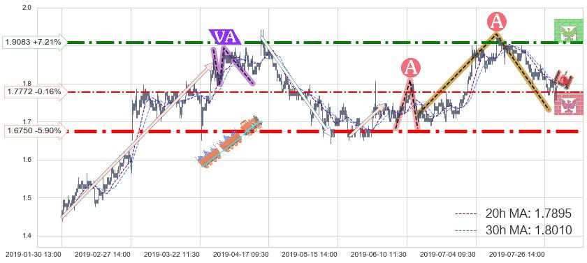 ♘ 阻力价格位1.9083,可信任强度76.18%,距离最后交易2019-07-31 15:00形成的收盘价格1.7800相差 +7.21%