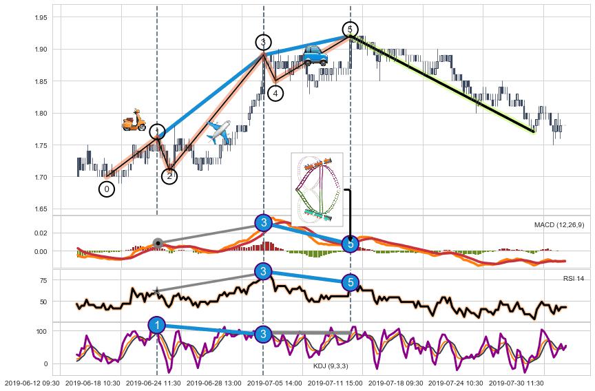 ➢ 1,3,5驱动浪MACD, RSI, KDJ走势都出现【常规背离】反转信号增强
