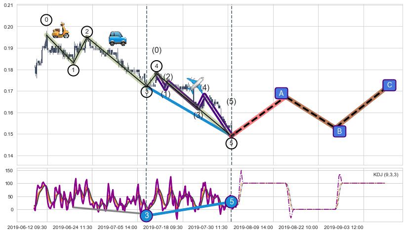 ➢ 第三,五驱动浪端点:【KDJ】走势出现【常规背离 & 反转信号】背离程度77.45%,背离夹角角度70.3˚,背离程度较大