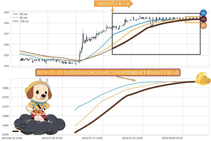 形态多维评估: ⚀ 2019-07-04 15:00:00小时-2019-08-09 15:00:00小时显现 60小时-90小时-120小时均线 【烘云托月】买入点 看多信号,后市看涨,买入