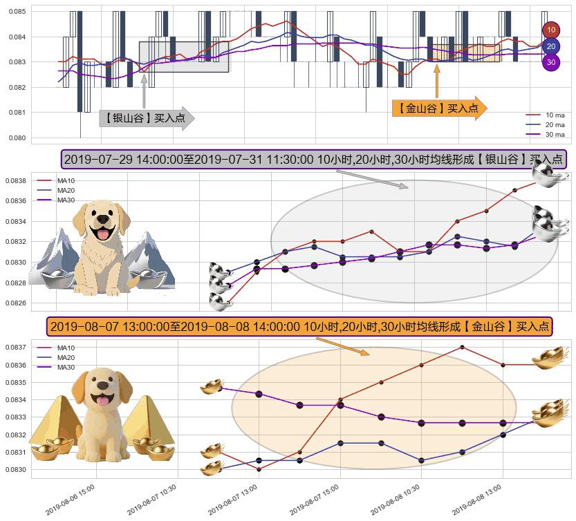 形态多维评估: ⚀ 2019-08-07 14:00:00-小时至2019-08-08 14:00:00-小时显现 10小时-20小时-30小时均线 【金山谷】买入点 其再次确认了买入信号,可靠性更强,买入