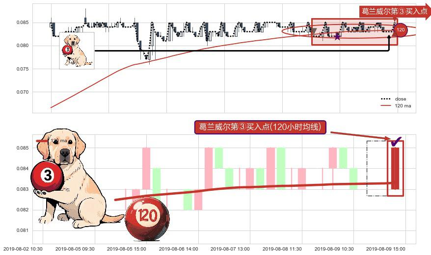 形态多维评估: ⚀ 2019-08-09 15:00:00-小时显现 葛兰威尔均线 120小时均线 第③买入点 上升趋势的中继信号,后市看涨,买进信号