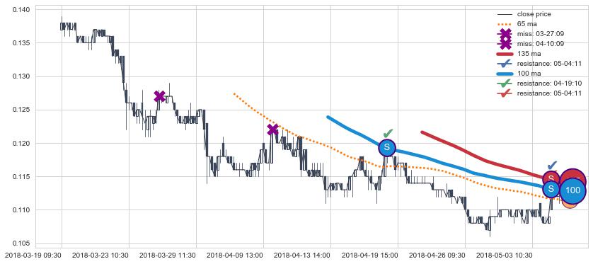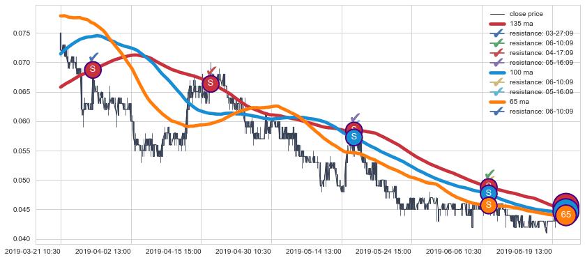 下跌趋势03-21 10:30-06-19 15:00,均线65, 100, 135确认关键阻力4处