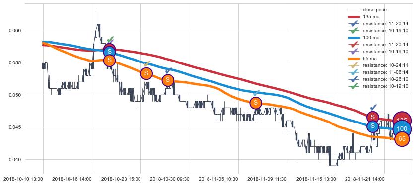 下跌趋势10-10 13:00-11-22 13:00,均线65, 100, 135确认关键阻力5处