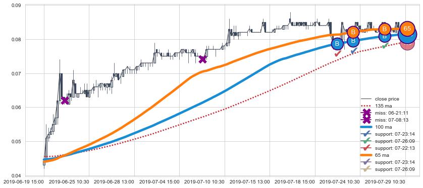 上涨趋势06-19 15:00-07-29 10:30,均线65, 100确认关键支撑3处