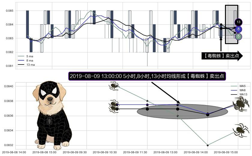 形态多维评估: ⚀ 2019-08-09 13:00:00小时显现 5小时-8小时-13小时均线 【毒蜘蛛】卖出点 看空信号,后市看跌,卖出