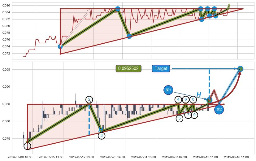 ➣ 最小中继整理涨幅→𝐇: 0.0090833 (上侧直角边第一阻力点②与斜边垂直距离)