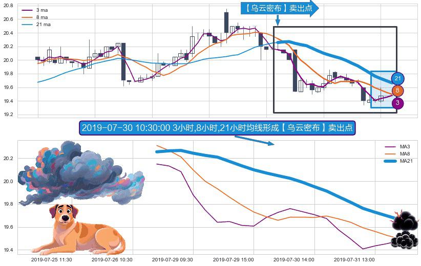 形态多维评估: ⚀ 2019-07-26 13:00:00小时-2019-07-31 15:00:00小时显现 3小时-8小时-21小时均线 【乌云密布】卖出点 看空信号,后市看跌,卖出