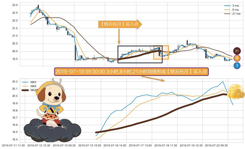 形态多维评估: ⚀ 2019-07-15 14:00:00小时-2019-07-22 10:30:00小时显现 3小时-8小时-21小时均线 【烘云托月】买入点 看多信号,后市看涨,买入