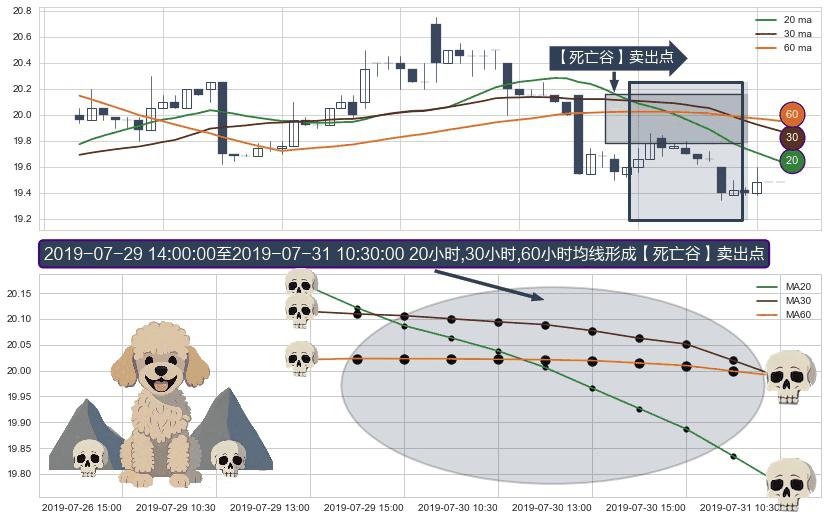 形态多维评估: ⚀ 2019-07-29 15:00:00-小时至2019-07-31 10:30:00-小时显现 20小时-30小时-60小时均线 【死亡谷】卖出点 看空信号,后市看跌,卖出
