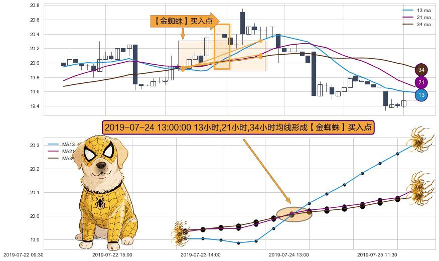 形态多维评估: ⚀ 2019-07-24 13:00:00小时显现 13小时-21小时-34小时均线 【金蜘蛛】买入点 看多信号,后市看涨,买入
