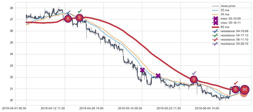 下跌趋势06-19 10:30-07-13 13:00,均线25, 34确认关键阻力3处