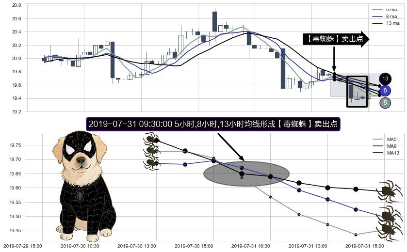 形态多维评估: ⚀ 2019-07-31 09:30:00小时显现 5小时-8小时-13小时均线 【毒蜘蛛】卖出点 看空信号,后市看跌,卖出