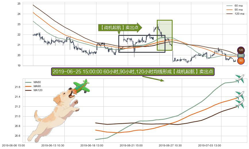 形态多维评估: ⚀ 2019-06-17 15:00:00小时-2019-07-04 15:00:00小时显现 60小时-90小时-120小时均线 【战机起航】卖出点 看空信号,后市看跌,卖出