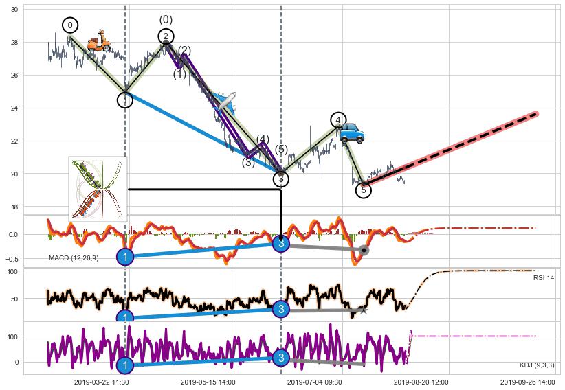 ➢ 1,3,5驱动浪MACD, RSI, KDJ走势都出现【常规背离】反转信号增强