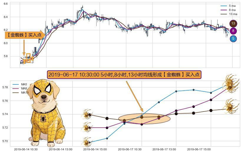 形态多维评估: ⚀ 2019-06-17 10:30:00小时显现 5小时-8小时-13小时均线 【金蜘蛛】买入点 看多信号,后市看涨,买入
