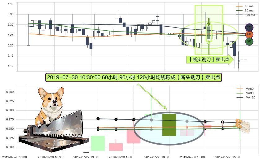 形态多维评估: ⚀ 2019-07-30 10:30:00小时显现 60小时-90小时-120小时均线 【断头铡刀】卖出点 看空信号,后市看跌,卖出