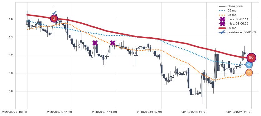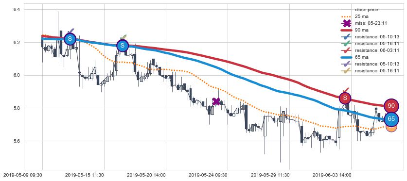 下跌趋势05-09 09:30-06-05 13:00,均线65, 90确认关键阻力3处