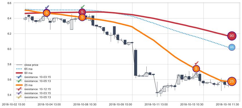 下跌趋势10-02 15:00-10-16 11:30,均线25, 90确认关键阻力3处