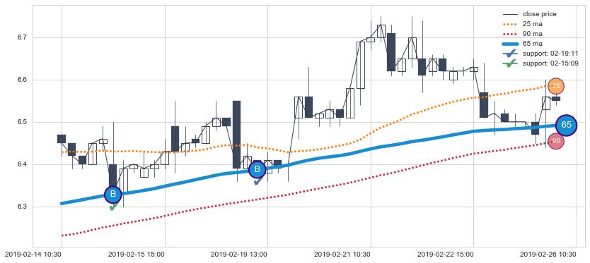 上涨趋势02-14 10:30-02-26 10:30,均线65确认关键支撑2处