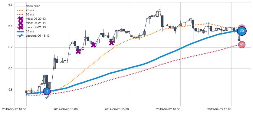 上涨趋势06-17 10:30-07-08 09:30,均线65确认关键支撑1处