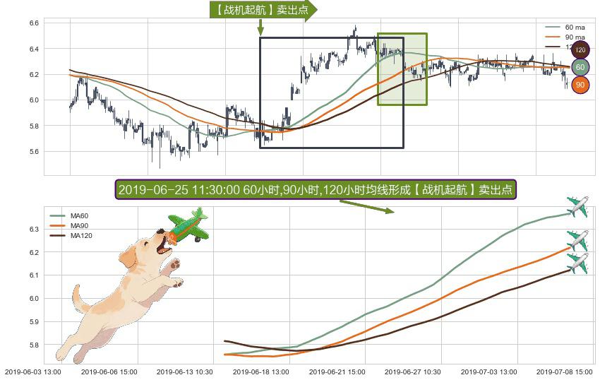 形态多维评估: ⚀ 2019-06-13 14:00:00小时-2019-07-05 15:00:00小时显现 60小时-90小时-120小时均线 【战机起航】卖出点 看空信号,后市看跌,卖出