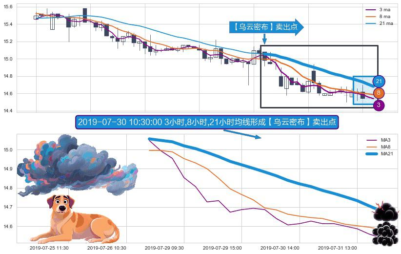 形态多维评估: ⚀ 2019-07-26 13:00:00小时-2019-07-31 15:00:00小时显现 3小时-8小时-21小时均线 【乌云密布】卖出点 看空信号,后市看跌,卖出