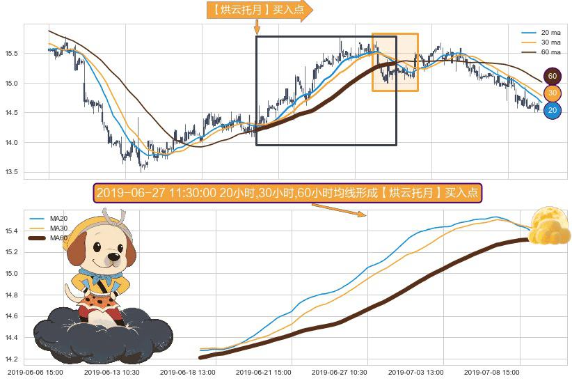 形态多维评估: ⚀ 2019-06-17 15:00:00小时-2019-07-09 15:00:00小时显现 20小时-30小时-60小时均线 【烘云托月】买入点 看多信号,后市看涨,买入