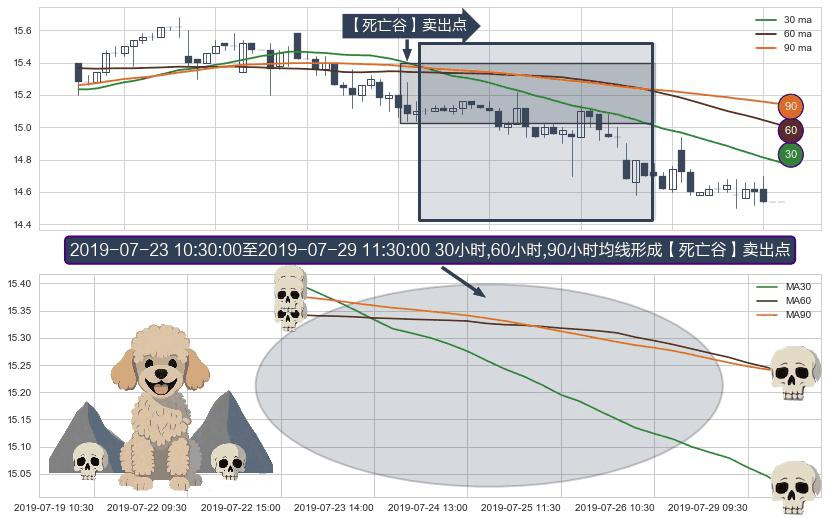形态多维评估: ⚀ 2019-07-23 11:30:00-小时至2019-07-29 11:30:00-小时显现 30小时-60小时-90小时均线 【死亡谷】卖出点 看空信号,后市看跌,卖出