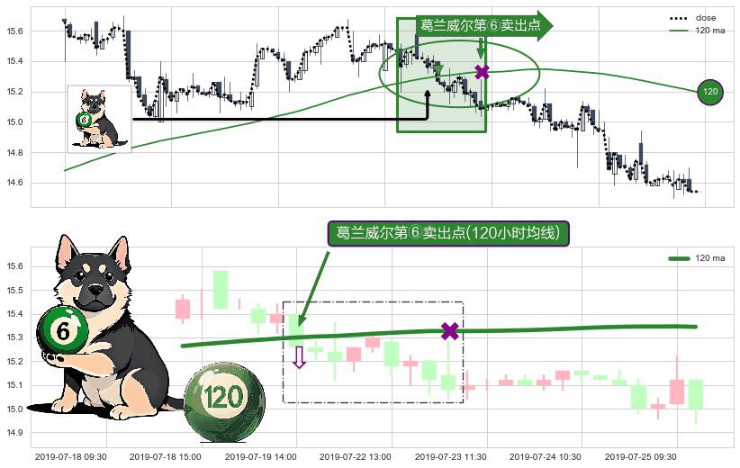 形态多维评估: ⚀ 2019-07-19 14:00:00-小时显现 葛兰威尔均线 120小时均线 第⑥卖出点 走势反转见顶信号,后市看跌,卖出信号