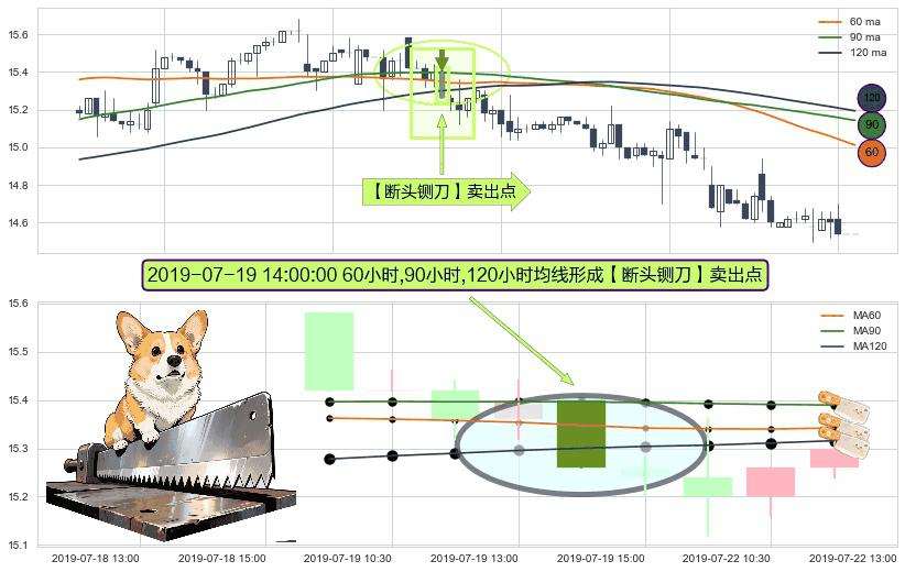 形态多维评估: ⚀ 2019-07-19 14:00:00小时显现 60小时-90小时-120小时均线 【断头铡刀】卖出点 看空信号,后市看跌,卖出