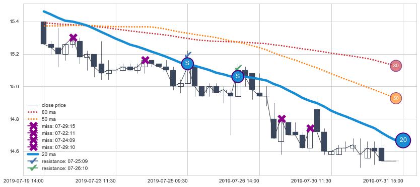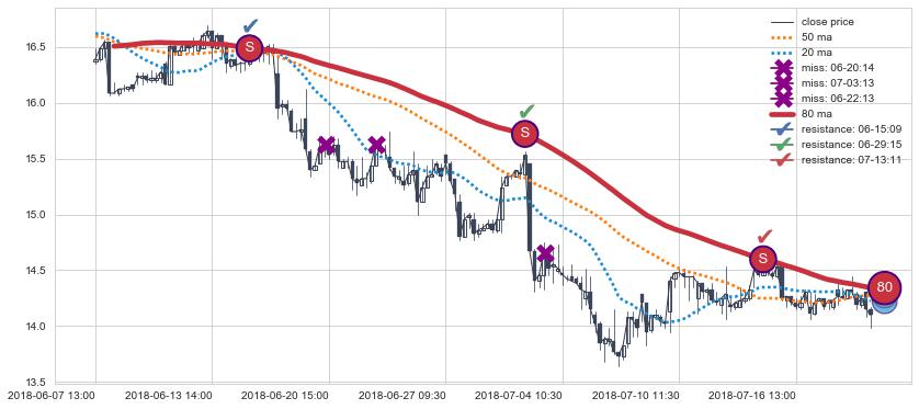 下跌趋势06-07 13:00-07-19 10:30,均线80确认关键阻力3处