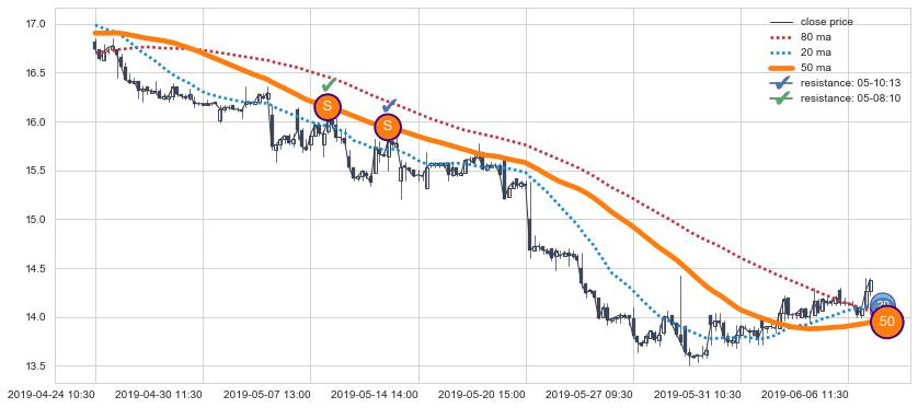 下跌趋势04-24 10:30-06-10 10:30,均线50确认关键阻力2处
