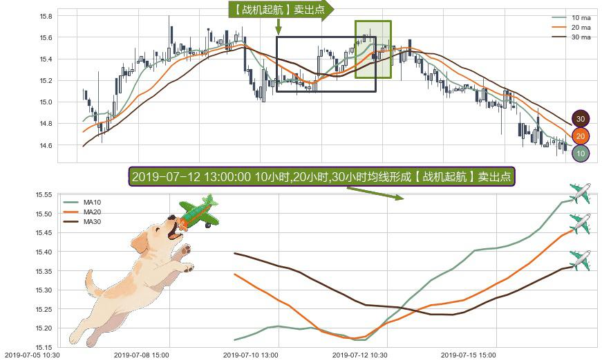 形态多维评估: ⚀ 2019-07-09 15:00:00小时-2019-07-17 09:30:00小时显现 10小时-20小时-30小时均线 【战机起航】卖出点 看空信号,后市看跌,卖出