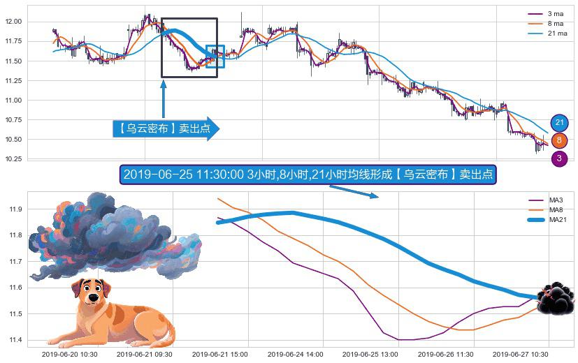 形态多维评估: ⚀ 2019-06-21 13:00:00小时-2019-06-27 10:30:00小时显现 3小时-8小时-21小时均线 【乌云密布】卖出点 看空信号,后市看跌,卖出