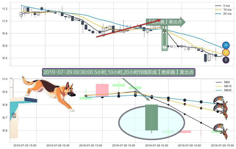 形态多维评估: ⚀ 2019-07-29 09:30:00小时显现 5小时-10小时-20小时均线 【绝命跳】卖出点 看空信号,后市看跌,卖出