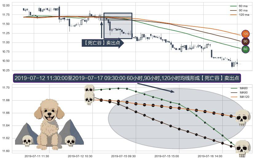 形态多维评估: ⚀ 2019-07-12 13:00:00-小时至2019-07-17 09:30:00-小时显现 60小时-90小时-120小时均线 【死亡谷】卖出点 看空信号,后市看跌,卖出