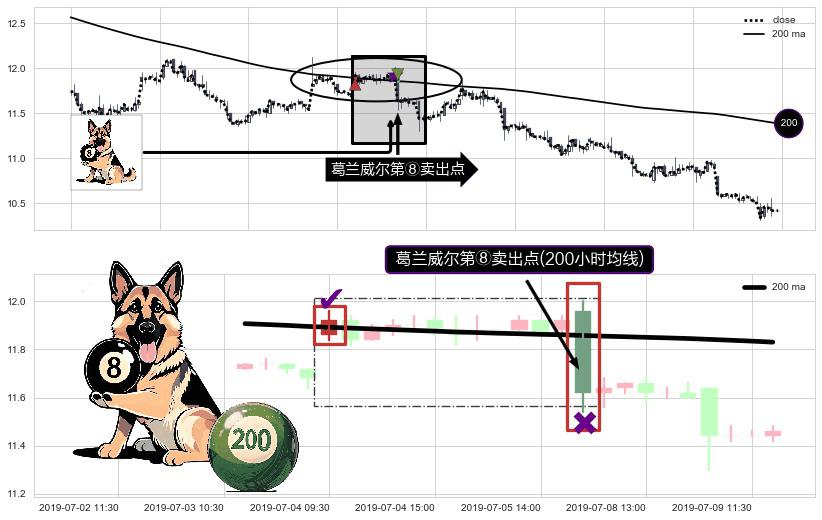 形态多维评估: ⚀ 2019-07-08 09:30:00-小时显现 葛兰威尔均线 200小时均线 第⑧卖出点 下降趋势的中继信号,后市看跌,卖出信号