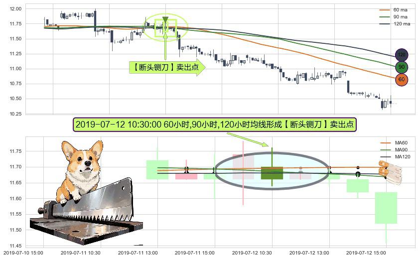 形态多维评估: ⚀ 2019-07-12 10:30:00小时显现 60小时-90小时-120小时均线 【断头铡刀】卖出点 看空信号,后市看跌,卖出