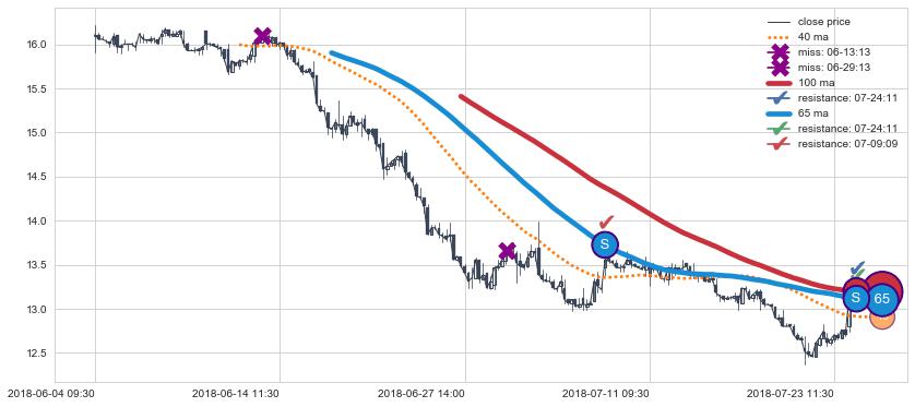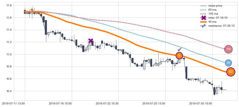 下跌趋势06-04 09:30-07-24 15:00,均线65, 100确认关键阻力2处