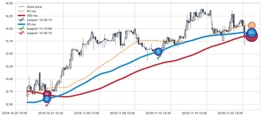 上涨趋势10-25 15:00-11-23 11:30,均线65, 100确认关键支撑2处