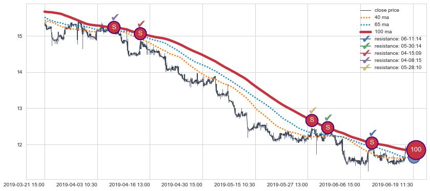 下跌趋势03-21 15:00-06-19 11:30,均线100确认关键阻力5处