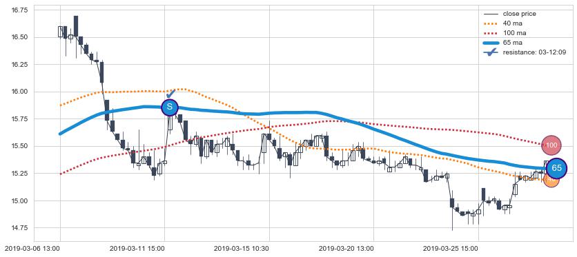 下跌趋势03-06 13:00-03-28 09:30,均线65确认关键阻力1处